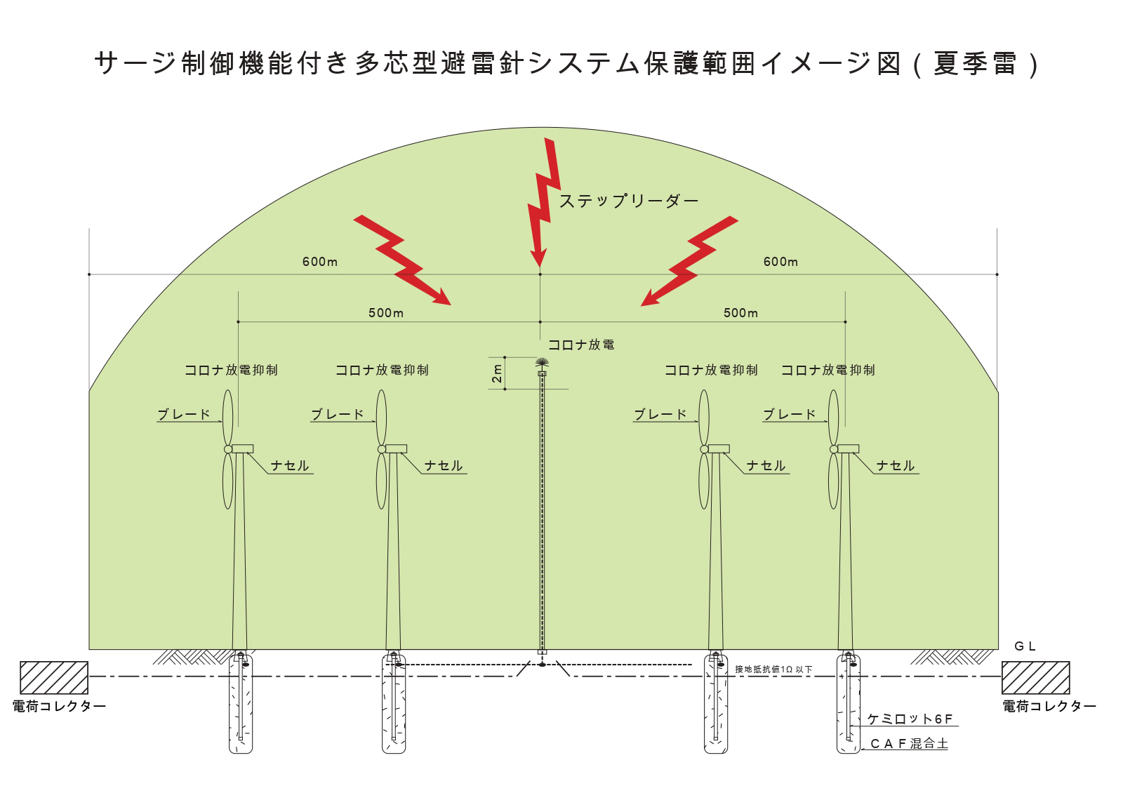 上記のような雷を、保護範囲の外で地上に現れる電荷をいち早くチャージコレクターで捕らえ、多芯型避雷針に伝達し、多芯の先端よりイオン放散を行う、風力発電基は地電位上昇を抑制し、しかもタイムラグをしてブレードよりのコロナ放電を抑える。