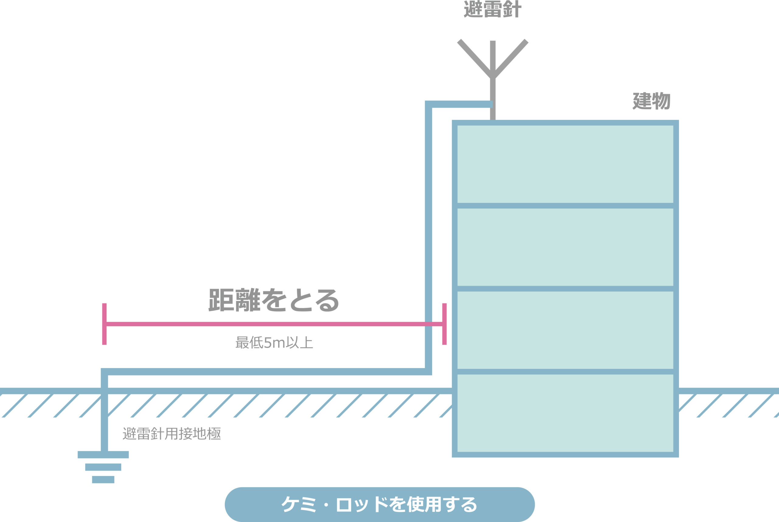 避雷針用接地は、建物構造体での接地(共用接地)を避け引き下げ誘導による接地を行う。