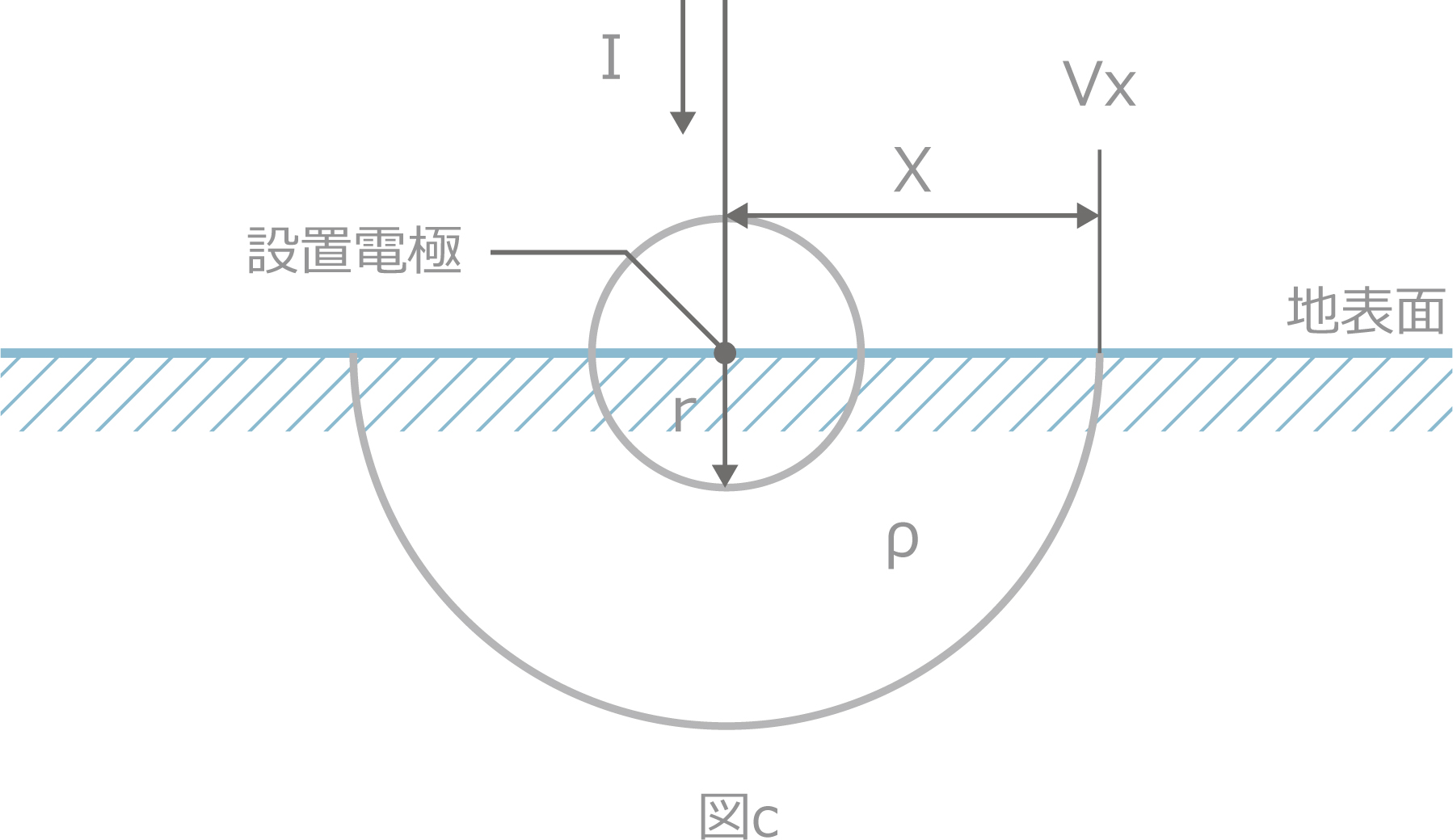 Vx:接地電極からx(m)離れた地点の電位、ρ:大地抵抗率(Ω・m)、I:接地電極に流入する電流(A)、x:接地電極からの距離(m)