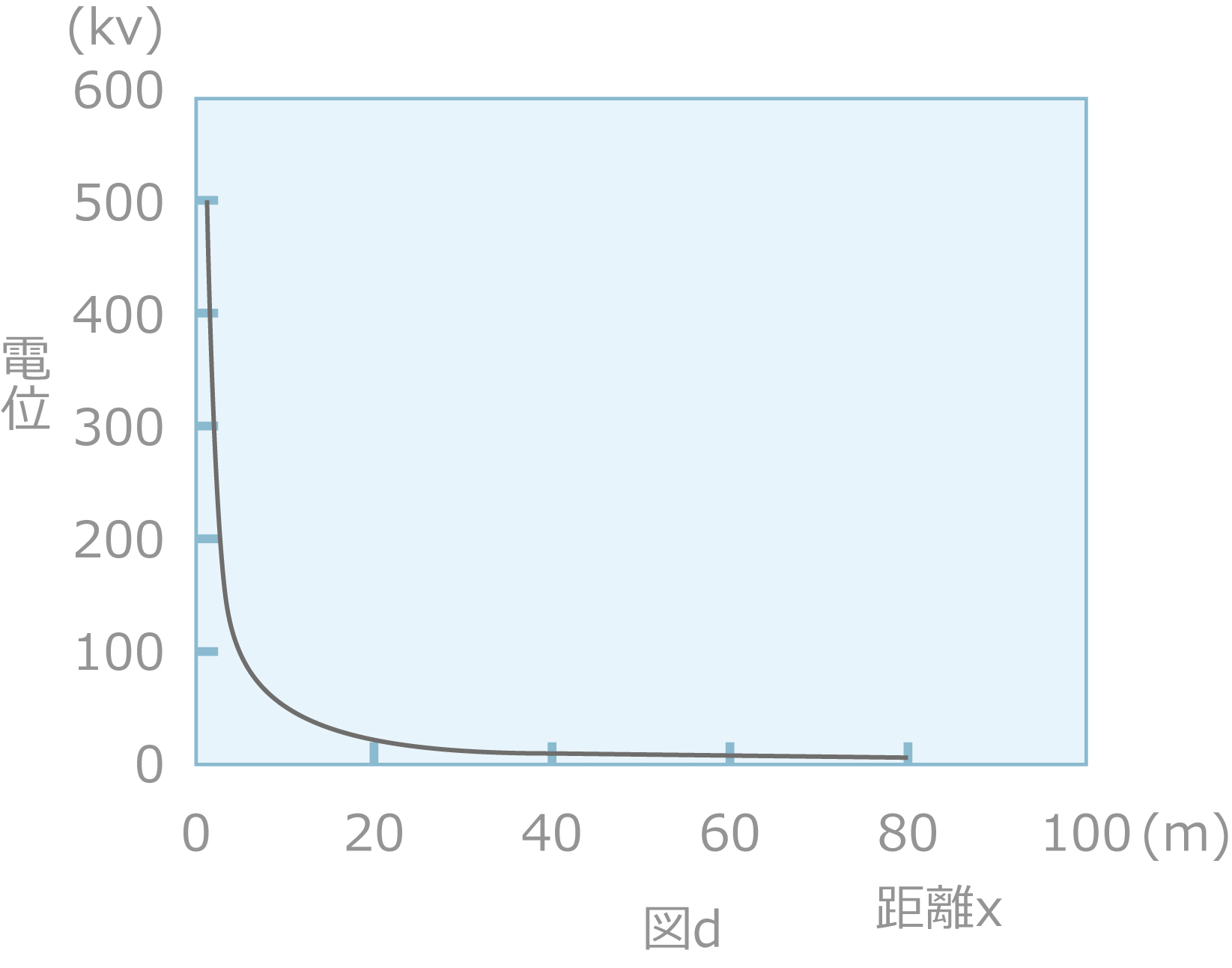 いま、ρ=100Ω・m、I=30KAとしてxとVxの関係を上記の式から求めると図(d)のようにxに反比例して小さくなります。